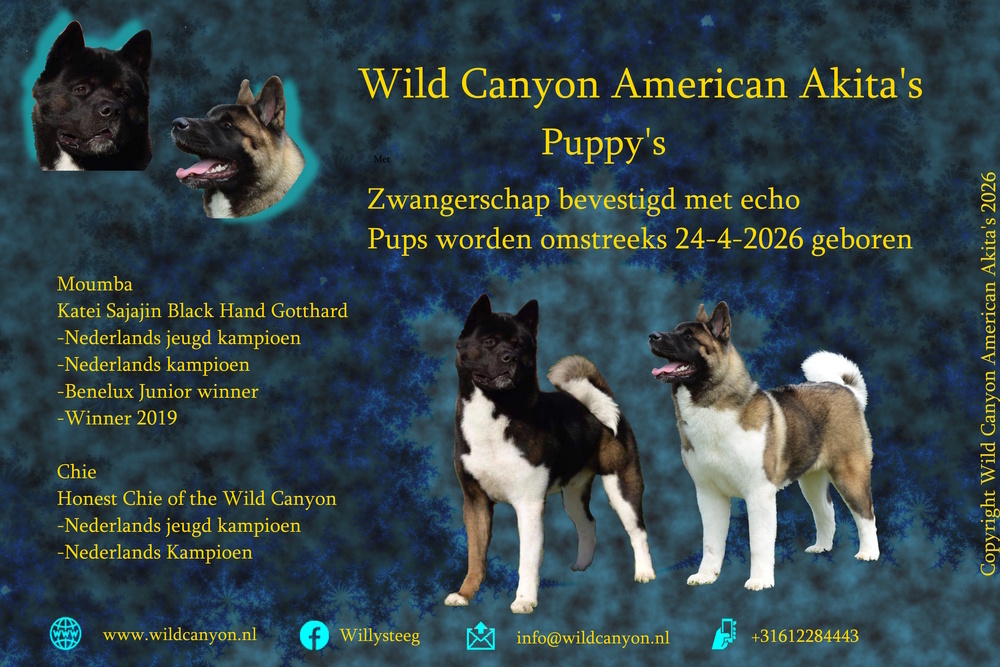 Op 20 februari 2026 is Chie (Honest Chie of the Wild Canyon) gedekt door Katei Sayajin Black Hand Gotthard, vandaag op 20-3-2026 hebben we een echo laten maken en ze is zwanger, de pups worden omstreeks 24 april 2026 geboren.